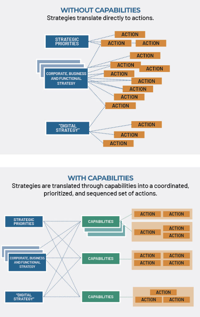 Capabilities serve as the bridge between strategy and execution by informing strategic decision making and ensuring that strategies are translated into a coordinated, prioritized, and sequenced set of actions for the enterprise. (See figure below.) They also help keep the portfolio of work aligned even as strategy evolves. Since capabilities are enabled by people, processes, information, and technology, they naturally integrate these elements and their design into a cohesive whole. Capabilities also provide the reusable building blocks that enable an organization to deliver consistent and seamless experiences to customers, partners, and employees.
